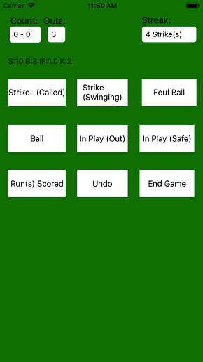 Very simple interface allowing for a small learning curve so you can download and get started right away. At this moment the only option available after the game is to Email the stats to you. This will allow you to keep track of all of their mound opportunities. We will soon offer a web interface that will take this data and keep a better history of their statistics. Keep as much information as you like, but the more you keep the better the information will be down the road. Know how your pitcher performs when down 3-0 or up 0-2.